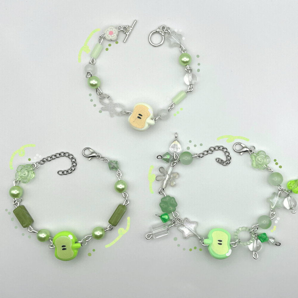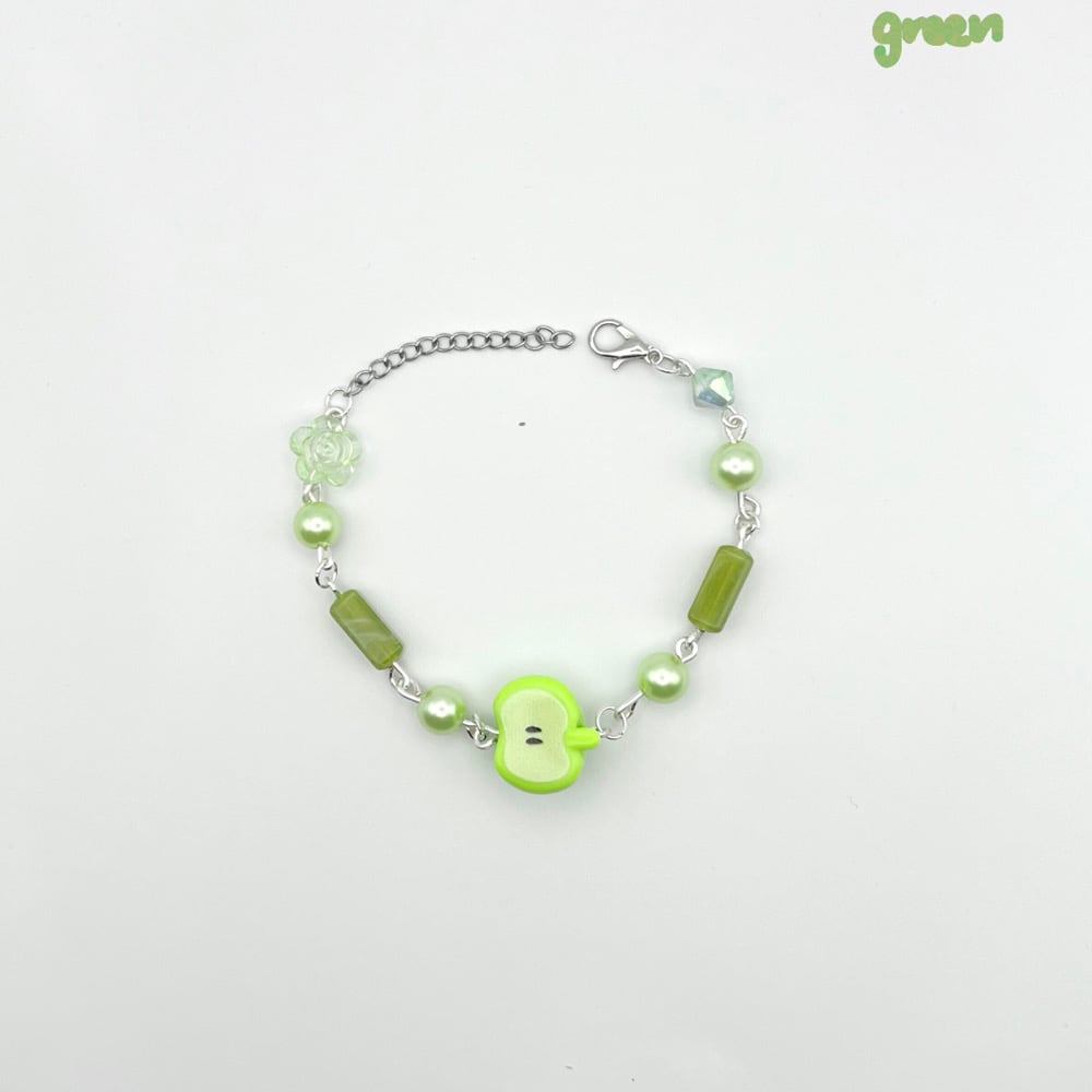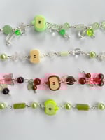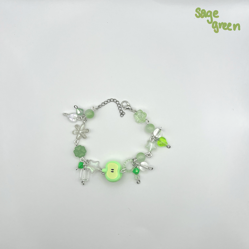 materials: silver-plated copper wire, stainless steel clasp, acrylic bead, gemstones, Czech glass